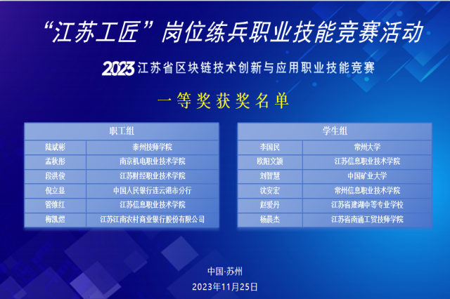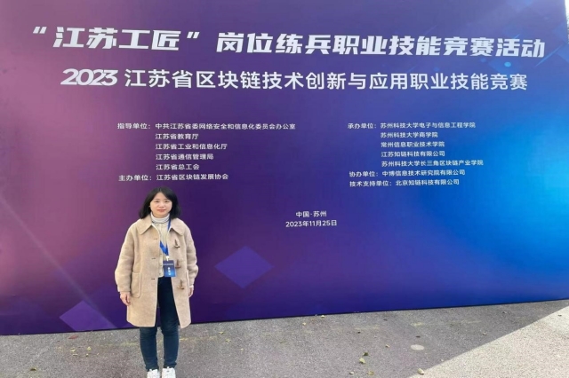 2023年11月25日上午,“江苏工匠”岗位练兵职业技能竞赛——2023年江苏省区块链技术创新与应用职业技能竞赛在苏州圆满落幕,来自省内院校、企事业单位的总计2000余人参加了本次竞赛。经过市赛选拔,我校孟秋彤老师进入决赛,最终以职工组第二名的成绩获得本次竞赛的一等奖,并被授予“江苏省五一创新能手”称号、“江苏省技术能手”称号,同时,球友会在线被授予优秀组织奖。