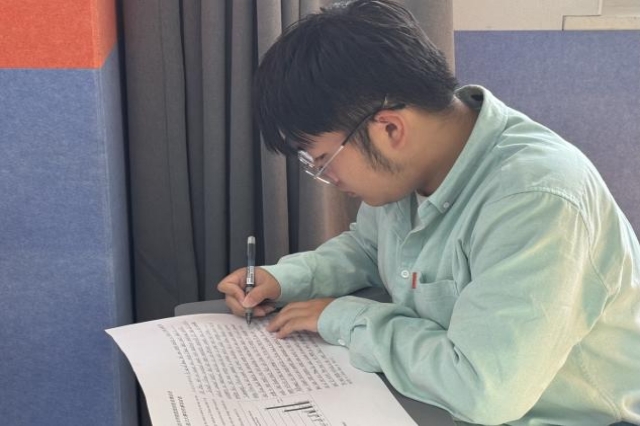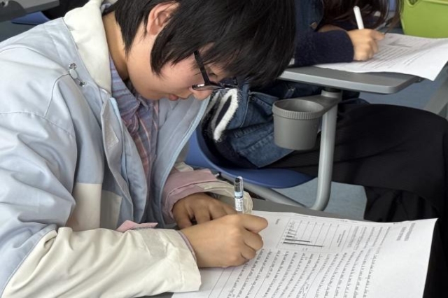 比赛题目由英语教研室拟定,并在比赛当场公布。比赛现场,选手们神态自若。他们神情专注,笔尖在纸上跳跃,时而沉思、时而疾书,全力以赴投入到这场英语写作的竞技中。