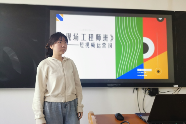 在本次项目中,郝逸萱老师重点分享了如何运用三阶递进精准育人。也就是采用“基础夯实-实践强化-岗位衔接”的三阶段培养体系。第一阶段(大一上学期),学生依托通识课程与专业基础课,夯实学生短视频创作理论功底,为后续实践奠定基础。第二阶段(大一下学期至大二学年),通过专业考核与双向选择,从相关专业中遴选30名优秀学生组建“工程师班”。企业导师驻校授课,引入真实项目案例,结合校内实训室开展短视频策划、拍摄、后期制作等模块化训练。第三阶段(大三学年)通过工学交替与岗位实习,学生直接参与西西里传媒旗下短视频项目的全流程运作,在真实工作场景中完成从“学员”到“职业人”的转变。