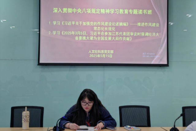 2025年5月15日下午,人文社科系党支部组织开展读书班活动,深入学习《习近平关于加强党的作风建设论述摘编》以及《2025年3月5日,习近平在参加江苏代表团审议时强调经济大省要挑大梁为全国发展大局作贡献》等重要内容。此次读书班由人文社科系党支部宣传委员阮雪君担任领学人,全系党支部全体党员老师参与学习。