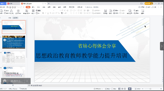 20211012日,思政中心教研室通过“线上+线下”的方式组织召开教学研讨会。卢璇老师做了关于思想政治教育教师教学能力提升培训学习汇报,思政中心全体教师参加了此次会议。