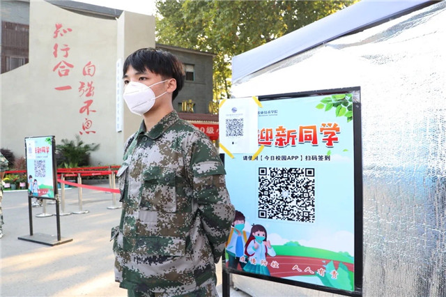 身份确认,查验苏康码。国防教育协会的同学们每天轮班在校门口站岗把关,不错过任何一位新生,也不放进任何一个“不速之客”。每一位新同学必须经过身份确认,查验苏康码,方可进入校园。