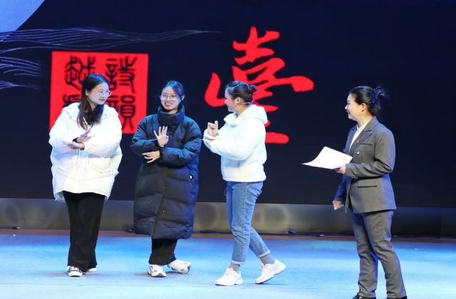 演出开始前,主持人邀请了几位同学上台互动,同演员学习越剧唱腔。以《红楼梦》为例,演员教同学们简单的摆出几个动作,体会越剧唱腔的清越悠扬,婉转动听。