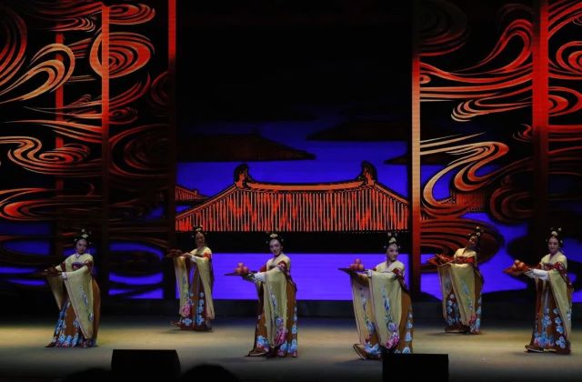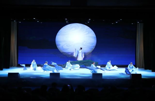 李白与孟浩然泛舟江上游金陵,吟诗作对,舞台的布置巧妙精美,加上舞台上灯光的点缀,将李白的潇洒不羁演绎的栩栩如生,淋漓尽致,同学们也被表演者深深吸引。正因有了以李白为代表的杰出诗人的铸就,才愈加绚烂多姿地映衬出大唐盛世之下的气象与魄力,文质与风骨,浪漫与奔放,自由与高贵,呼应着神来,气来,情来的隽永诗风和文化意境。