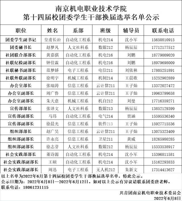 为切实加强学生干部队伍建设,本着“公平、公正、公开”的原则,进行了球友会在线2022-2023学年学生干部换届选举工作,通过学生自主报名、组织推荐、资格审查、竞选答辩、综合考察等环节,选拔产生了拟任人选,为提高学生干部选拔的透明度,现将拟任人选的名单予以公示。