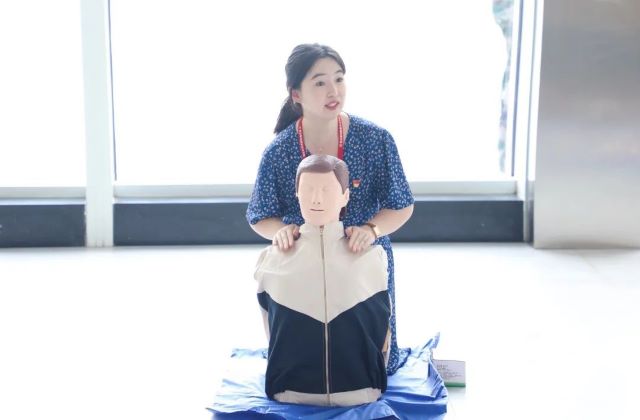 在培训过程中,金老师用浅显易懂的语言,围绕日常生活中可能发生的突发事件与相关急救措施,与同学们展开交流互动。接着通过现场演示,金老师深入浅出地讲解了心肺复苏、AED使用等急救处理知识,并利用模拟人对心肺复苏的过程进行了现场分解演示,让同学们准确领悟了心脏按压”“人工呼吸等技能的要点。
