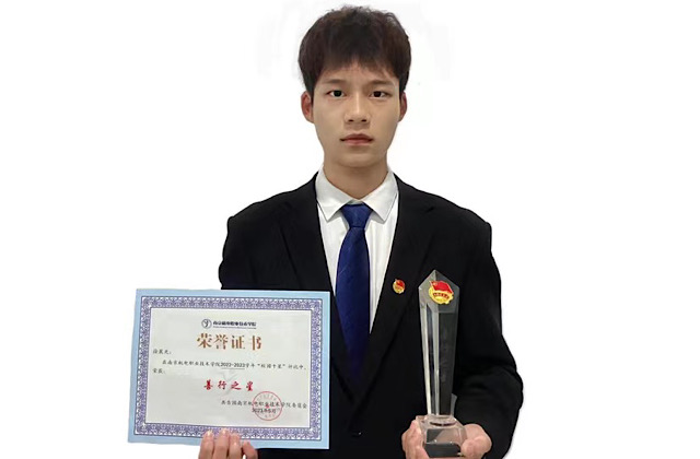 徐晨光,男,汉族、共青团员,毕业于湖北省荆州市洪湖市贺龙高级中学,来自信息工程系软件技术213班。现担任校团委助理、校团委宣传部副部长、班级副班长、团支部副书记、心理委员、墨客书法社社长、群星争鸣辩论社副社长、思齐苑301宿舍长。在校负责球友会在线学工处微信公众号、球友会在线官方抖音号运营工作。在球友会在线学工处微信公众号打造【防疫锦囊】、【禁烟科普】、【学工周记】特色系列推文。【禁烟科普】系列推文的打造为我校师生的身体健康提供了可靠的理论支撑,拓展了我校健康教育的内涵,有力推动了校园精神文明建设。2022年度共参加校内为志愿服务60余次,累计服务时长超过500小时。