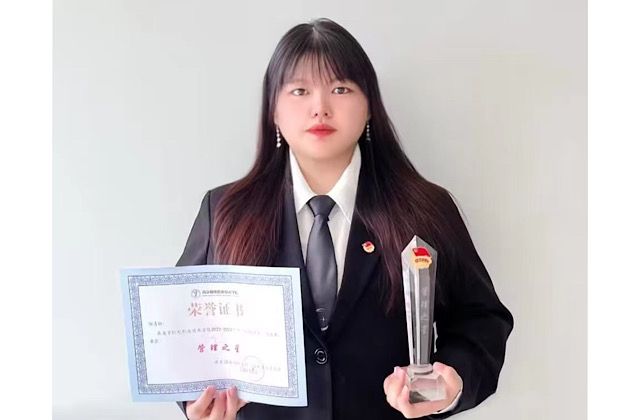 2021-2022学年,荣获球友会在线优秀共青团员、优秀志愿者、暑假社会实践优秀个人;2022年4月,荣获南京新工投资集团疫情防控荣誉证书;2022年10月,荣获“训练标兵”称号;2022年11月,荣获第二期青马班“结业证书”及“优秀学员”称号;2022年11月,荣获“第十四期学干培训优秀学员”。2023年3月;荣获校“寒假社会实践优秀个人”“优秀团队”;2023年4月,荣获高淳国际马拉松志愿者证书;2023年4月,荣获第七届江苏省大学生知识产权知识竞赛中荣获优秀奖。