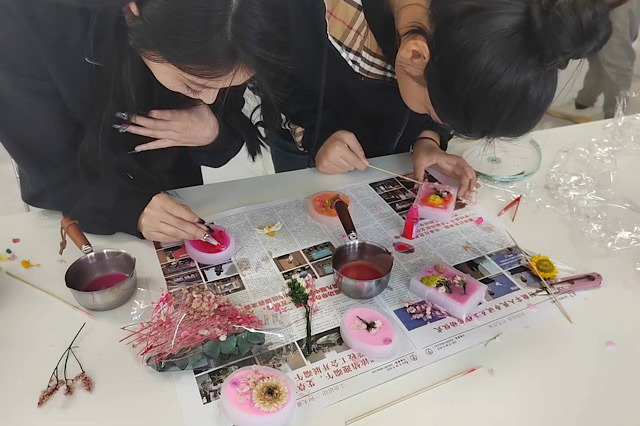 活动伊始,汉服社为同学们讲解传统文化,学习拱手礼,在互行拱手礼后,由花社为同学们讲述制作过程。同学们先选择好自己喜欢的香薰精油,把融化后的蜡油倒入到提前准备好的模具中等待凝固,放入干花进行装饰,就完成制作。制作过程中香薰干花蜡烛散发的清香,让同学们尽享嗅觉和视觉的双重盛宴。