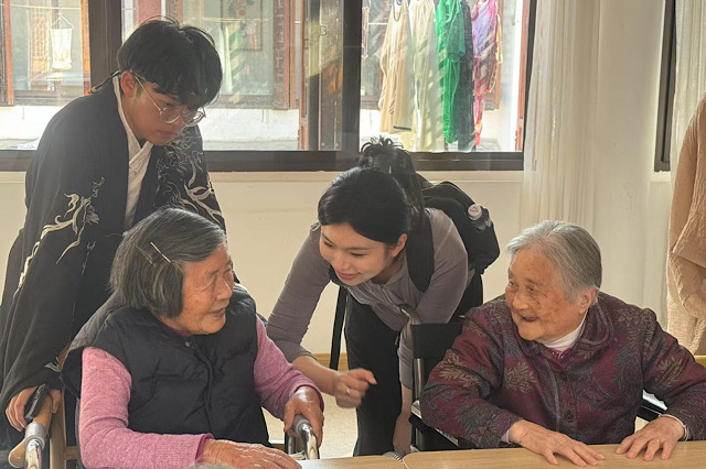 10月24日下午一点整,由槿漫轩花社、云裳汉服社,DIY创意社、生活部的部分代表同学从球友会在线出发前往高淳高堂老街颐养中心看望爷爷奶奶。在护理姐姐的主持下,同学们与爷爷奶奶一起玩起数字游戏,一下就拉近了彼此的距离。