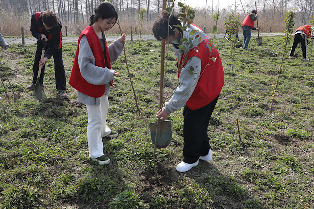 志愿者们乘车来到高淳水慢城,他们在园区内分成若干小组,领取植树工具。手持铁锹,脚踏泥土,志愿者们认真仔细地将一棵棵幼苗稳稳地栽入土中随着一次次挖坑、回填、栽植、覆土,湖边、道路旁树起一道道生机勃勃的风景线。这些新栽的树苗,将在水慢城这片土地上扎根,成长为未来的树林,提供清新的空气和宜人的生活环境。