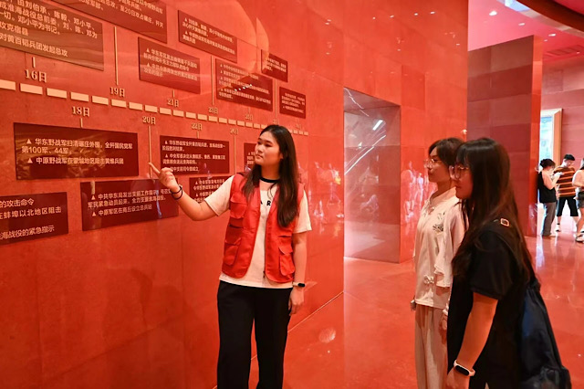 第二天,团队成员孙雨涵、翟雨璐在纪念馆内开展志愿宣讲活动。他们结合所学,用通俗的语言向参观游客讲述淮海战役中的英雄事迹与支前故事,让红色历史更接地气、更入人心。同时,队长杨壮还精心策划并拍摄红色宣传视频,通过镜头记录场馆里的历史印记与宣讲中的感人瞬间,进一步扩大红色文化传播范围,让爱国主义精神通过新媒体平台进一步延伸。