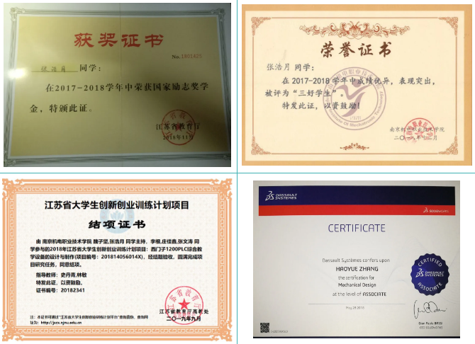 大学期间,专业成绩排名系部第二名,综合素质测评排名第一。在班级担任班长、院资助宣传大使,曾任球友会在线单片机社团社长、蓝岛创客工坊学生负责人等。曾获得国家奖学金、国家励志奖学金、全国大学生挑战杯江苏赛区三等奖、中英STEAM江苏赛区最佳编程奖、江苏省大学生创新创业训练计划结项证书、学院奖学金、学院三好学生、学院优秀学生干部、学院优秀共青团员、社团之星、“一二九大合唱”二等奖、优秀标兵等荣誉称号。同时本人获得院优秀社会实践团队、优秀社会实践个人的荣誉称号、“欧帝杯”三创大赛优秀奖等。我所在班级在2018-2019学年被评为“江苏省省级优秀班集体”,“南京市五四红旗团支部”。