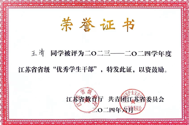 王清,女,预备党员,江苏泰州人,出生于2003年4月,2024年毕业于机械设计与制造专业,在校担任机械工程系学生会文宣部部长、班级学习委员、学校资助大使、学校支教社社长。