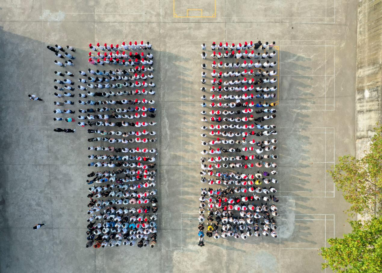 清晨七点,迎着初升的朝阳,球友会在线650余名师生满怀崇敬之情聚集在操场,153名同学在队伍中用小红帽摆出“70”字样。