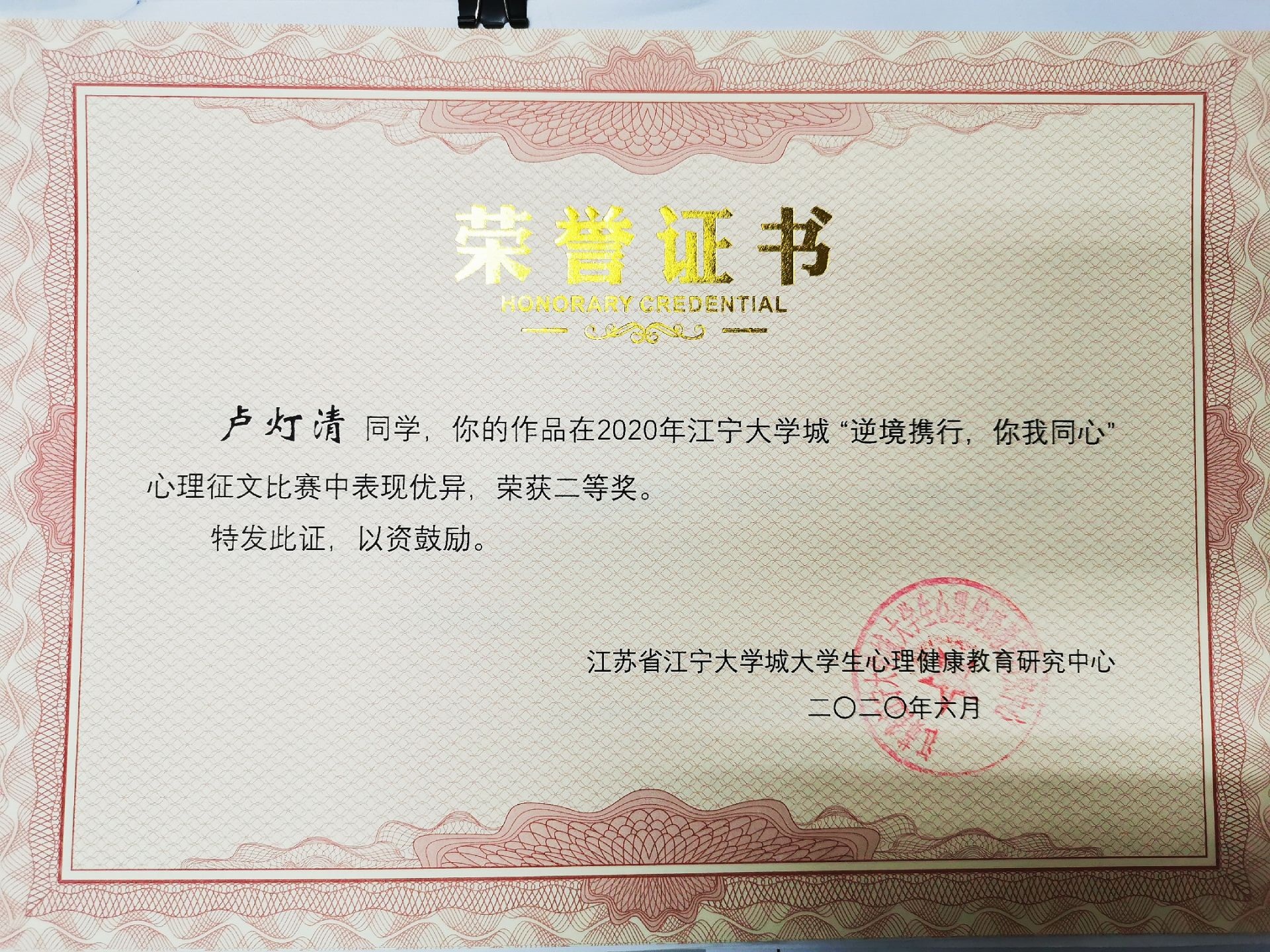2020年4月我系心理气象站积极参加学院学生工作处大学生健康成长中心组织的江宁基地“逆境携行,你我同心”心理海报、心理漫画设计和心理征文比赛,经过学院筛选我系三份心理征文作品和一份心理海报被推送到江苏省大学生心理健康教育与研究中心(江宁基地)江宁大学城参与评选。