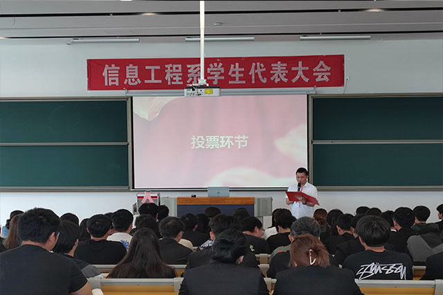 信息工程系团总支代表吴雨蔓宣读学生代表大会贺词,学生会主席李想宣读信息工程系第四次学生代表大会代表资格审查报告,学生会副主席陶林峰宣读《球友会在线信息工程系第四次学生代表大会选举办法》,各项报告在热烈的掌声中一致通过。