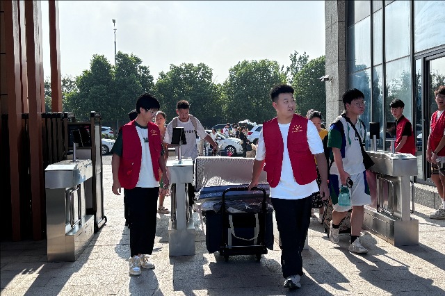 来到学校门口,一幅热闹而有序的画面映入眼帘。志愿者们如同一群勤劳的小蜜蜂,穿梭在人群中。他们主动上前,帮助新生搬运行李,那沉甸甸的行李在他们手中仿佛变得轻如鸿毛。他们一边搬运行李,一边还不忘向新生介绍校园的各个角落,让新生们对即将开始的校园生活充满了期待。
