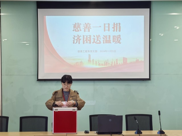 为深入贯彻落实党的二十大精神以及习近平总书记关于慈善工作的重要讲话精神,大力弘扬扶贫济困、友爱互助这一中华民族传统美德,信息工程系积极响应南京市开展 2024 年“慈善一日捐、济困送温暖”活动号召,于11 月5日下午在弘德楼西塔602会议室组织开展了“慈善一日捐・济困送温暖”捐款活动。本次活动由党支部书记胡枫主持,信息工程系全体教职工参加。