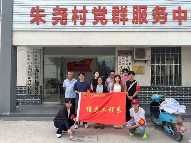 2025 年7月至8月,信息工程系 “知行孙楼・青衿服务团”(以下简称 “服务团”),赴江苏省徐州市丰县孙楼街道开展暑假 “三下乡” 实践活动。服务团以“青筑孙楼”为主题,聚焦助老、环保、安全、儿童关爱四个方面,提供精准服务。