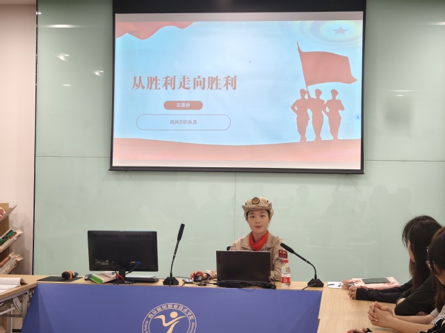 活动开场,臧琼介绍左星桥的成长历程。作为该系软件技术专业毕业生,左星桥在校时深耕专业知识,积极投身校园志愿服务与学生工作,用行动诠释“责任”;2025年年初,她主动报名参与 2025 年九三阅兵民兵方队选拔,经数月高强度训练,凭坚韧意志与过硬素质完成阅兵任务,成为方队中亮眼的青春风景。