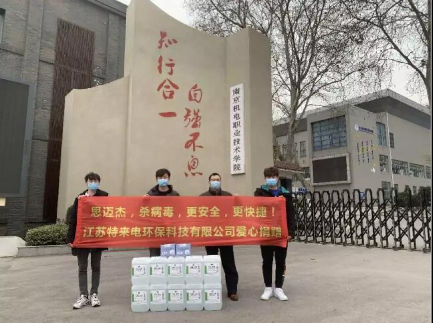 江苏特来电环保科技有限公司副总经理闫斌校友(2017届检测技术及应用)、销售经理徐浪校友(2018届供用电技术)和项目经理梁建伟校友(2019届供用电技术)心系母校,向母校捐赠消毒水和口罩等抗疫物资,支持学校的疫情防控工作。闫斌等三位校友表示:疫情无情人有情,希望学弟学妹安全健康返回校园。祝愿母校越办越好,顺利搬迁新校区。
