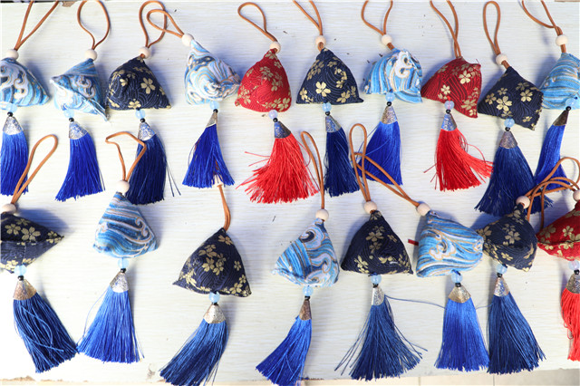 活动现场展示了许多精美的端午节特色的手工艺品,如香囊、五彩绳、毛毡等,原来这些都是比赛的奖品。大家欣赏着精美手工艺品,讨论着端午节习俗,现场一片欢声笑语。