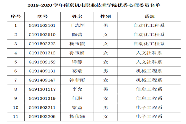 根据球友会在线《优秀心理委员评选细则》规定,经自主申报,各系心理气象站推荐,学生工作处核准,学校审批,决定授予丁志恒等11名同学“优秀心理委员”的荣誉称号。 希望受表彰的同学再接再厉,继续发挥引领和表率作用,在学院心理健康教育工作中发挥更大的作用!