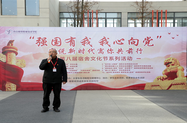 学生工作处处长张宝中首先代表全体师生对默默奉献的宿管老师表示衷心的感谢。张处在致辞说道:文化节弘扬了中华民族的传统文化,身为南京机电的一名新时代青年应大力传承传统文化,提高个人文化修养、塑造自身形象,宿舍文化节是校园文化中不可分割的一部分,倡导同学们积极参加系列活动,加强同学之间的友谊,营造校园温馨氛围。