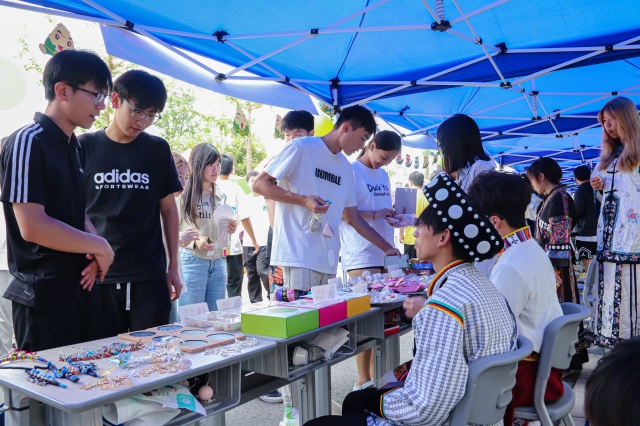 除了美食,活动还设置了民族服饰试穿和饰品展示区。苗族银饰、藏族珊瑚项链、彝族刺绣荷包等精美工艺品一字排开,参与者可自由试戴并聆听学生志愿者讲解其工艺寓意。民族服饰试穿区更是人气高涨,师生们纷纷换上苗族服饰、戴上银饰,穿上蒙古袍、哈萨克族刺绣马甲拍照留念。“这是我第一次穿苗族的服饰,走起路来叮咚作响,仿佛能听到山林的声音。”学工处朱老师体验后感慨。