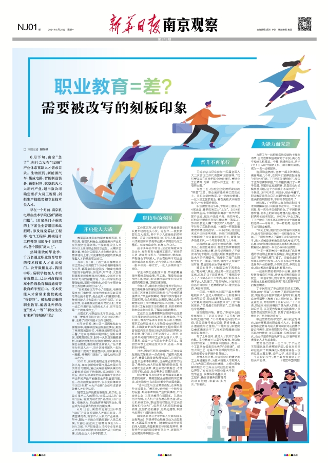 2024年6月24日的《新华日报》刊载《职业教育=差?需要被改写的刻板印象》文章,整版报道了自动化工程系与上海三菱电梯产教融合背景下学生高质量实习就业成果。全文如下: