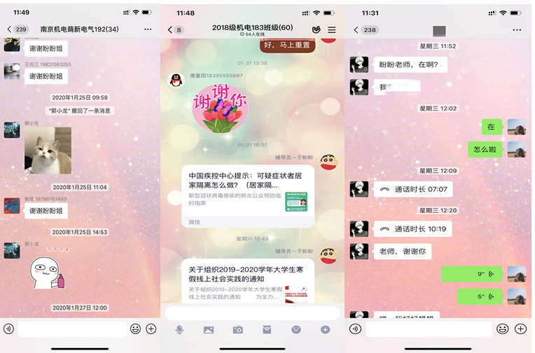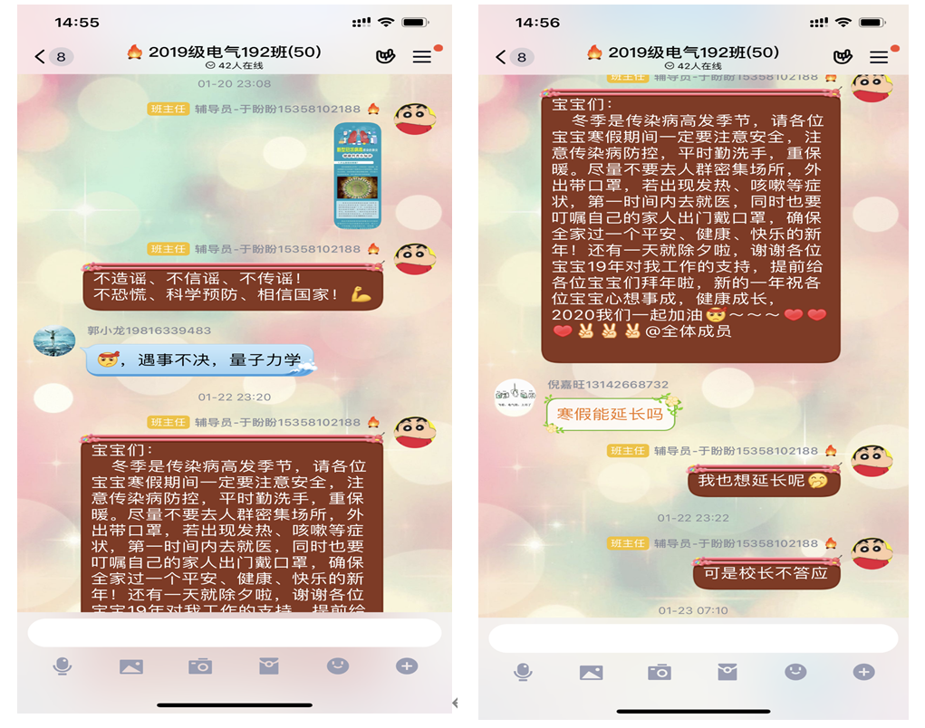 防疫期间,我的骨干班委也发挥了很大的积极作用,帮助我联系同学、询问信息,并主动把有用的学习资料和疫情信息发到群中,让我欣慰的同时更觉得自己工作的意义。