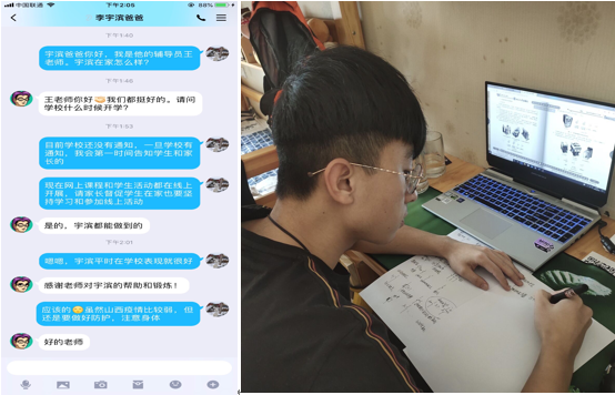 辅导员王晨歌在疫情期间与李宇滨的家长进行了沟通。家长说,孩子每天配合辅导员严格把控班级同学的身体状况和所在位置,对于学校和辅导员所做的防疫工作非常理解和支持;开展网课以来,李宇滨按时听课和提交作业,在班级起到了模范带头作用;每天看着孩子认真的模样,家长表示非常欣慰。另外,家长表示,学校的这份关爱,让每一位家长的心里暖暖的,当初选择了南机电真是太对了!谢谢为了学生放弃休息时间认真工作的老师。