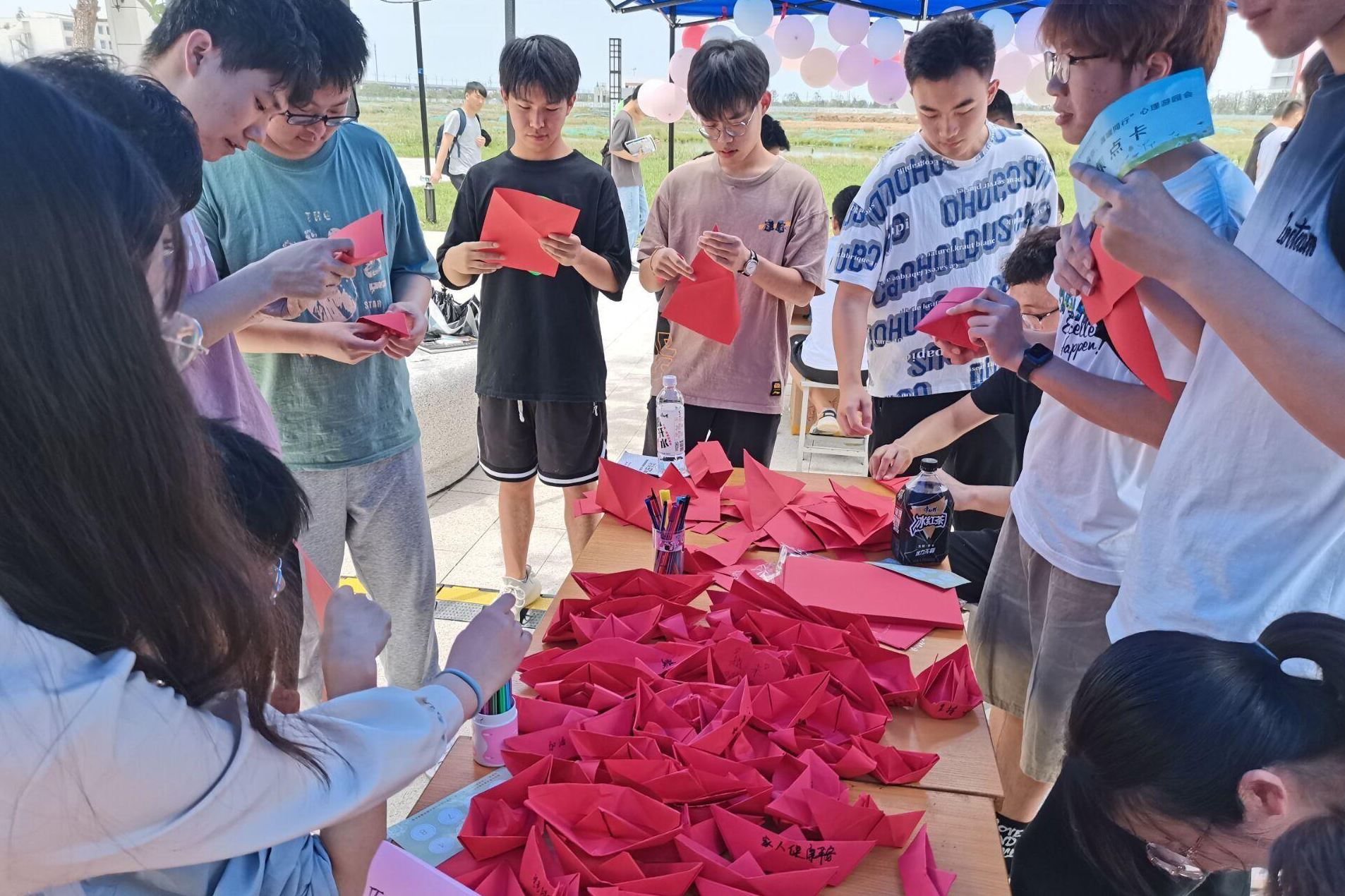 游园会由“巧手折红船,身心齐向党”、“心灵陪伴,你我共绘”两个部分组成。浙江嘉兴南湖的红船,是中国共产党宣告诞生的地方,孕育了伟大的红色基因,同学们共同折出一百只红色纸船,旨在用红船精神指导自己的学习和工作,不断树立对中国特色社会主义的信念以及对中华民族伟大复兴的信心;接着,参加游园会的老师和学生共同在绘布上共同创作出一幅画,在共同创作的过程中治愈了心灵。