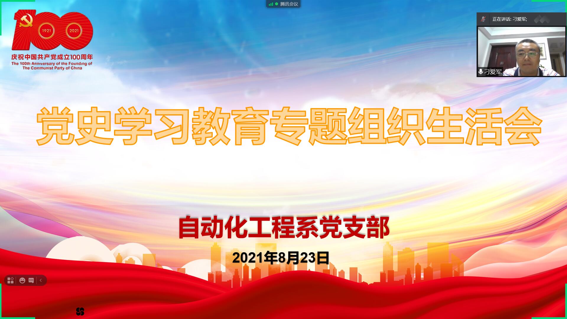 根据《南京机电产业集团关于召开党史学习教育专题组织生活会有关事项的通知》的精神,8月23日,我系党支部线上召开党史学习教育专题组织生活会,会议由党支部副书记高水冕主持,学校党委委员、副院长刁爱军莅临指导,自动化工程系主任潘理平以及系部全体党员参加本次会议。