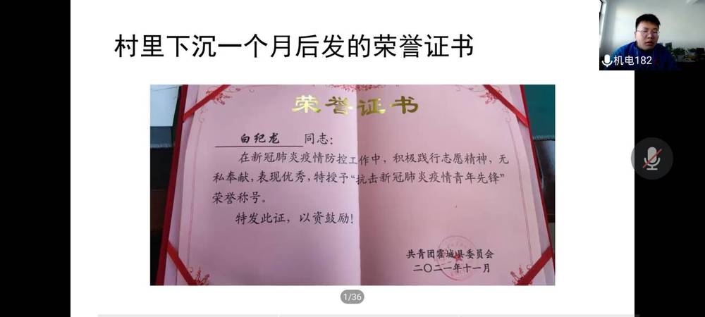 2021年8月,白纪龙以西部计划志愿者的身份加入并服务于新疆霍城县委组织部。他用幽默诙谐的语言为大家分享了自己在当志愿者期间多彩丰富的生活,让同学们认识到青春不只是诗和远方,更要有国家担当!在村里疫情防控的工作中,白纪龙积极践行志愿精神,无私奉献,荣获“抗击新冠肺炎疫情青年先锋”荣誉称号。白纪龙同学在讲述时眼睛里满满都是自豪与光荣。