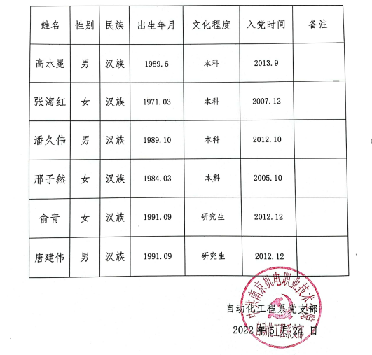自动化工程系党支部候选人预备人选公示表