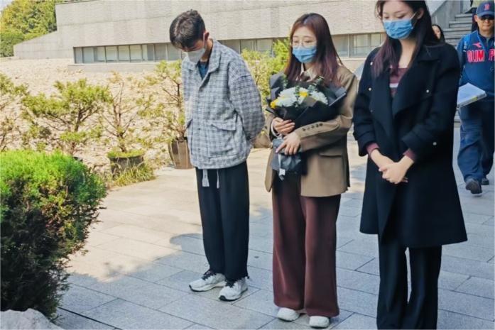 在到达纪念馆万人坑的石碑前,同学们纷纷默哀并献上了代表着缅怀的白菊。