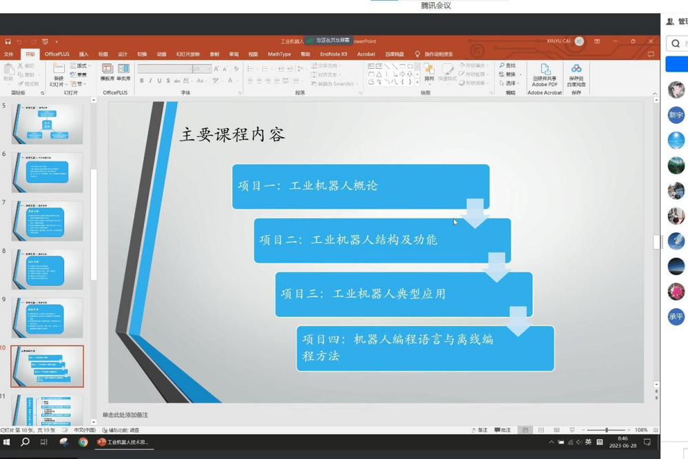 为贯彻落实《高等学校课程思政建设指导纲要》(教高〔2020〕3号)、《球友会在线“课程思政”建设实施方案(2021年-2023年)》(南机电院委〔2021〕24号)等文件精神,全面推进课程思政教学改革创新,深入挖掘课程思政内涵,强化课程育人导向,挖掘和丰富课程育人内涵,充分发挥课堂教学育人主渠道作用,6月28日上午8点45分,机电一体化教研室在线上组织开展2023年课程思政说课达标赛初赛。本次活动由朱红娟老师主持,机电教研室全体教师出席。