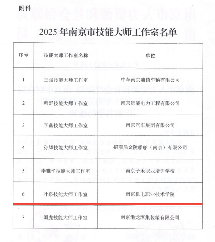 近期,南京市人力资源和社会保障局公布了2025年“南京市技能大师工作室”名单。自动化工程系机电一体化专业负责人叶泉领衔的“叶泉技能大师工作室”脱颖而出,入选“南京市技能大师工作室”。